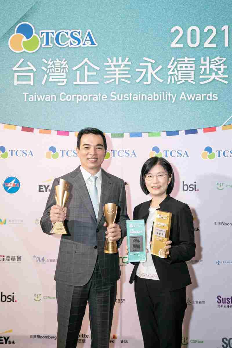 达在台湾永续奖所评比环境、、、社会、、、、治理等各面向的永续绩效均获高度肯定 (左:尊龙集团光电总经理暨营运长柯富仁,,,右:尊龙集团光电永续长古秀华)